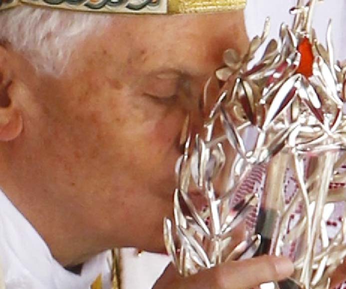 The Pope closes his eyes, kisses and adores blood taped from John Paul II before He died.