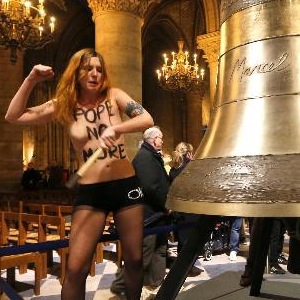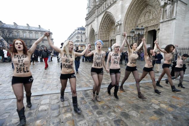 Some nine women with the Ukrainian group Femen flashed their breasts at the iconic site while ringing the cathedral’s huge church bells and shouting “Pope No More.