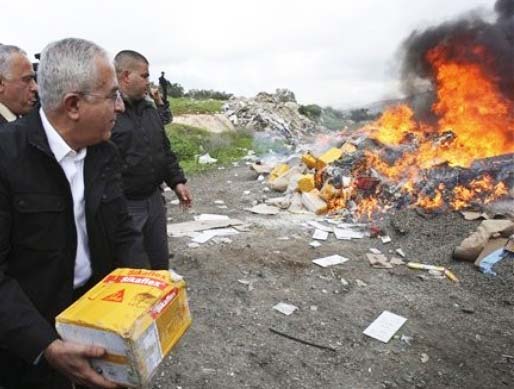 Fascist dictator and terrorist Salam Fayyad burn Israel products just north of Jerusalem.