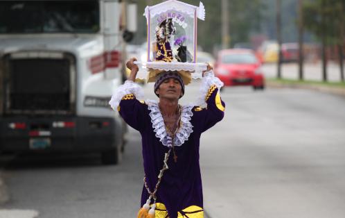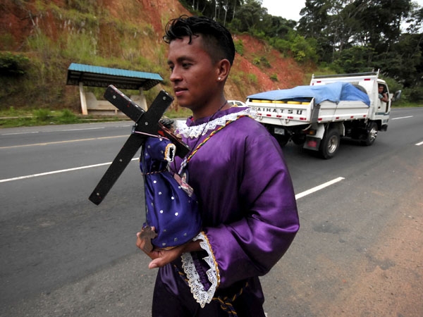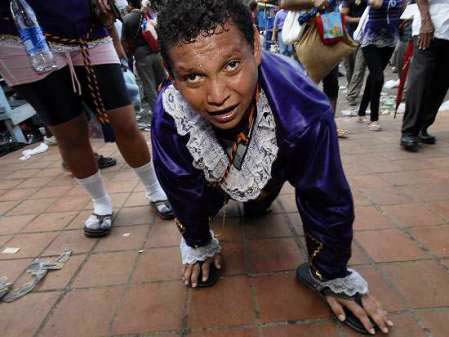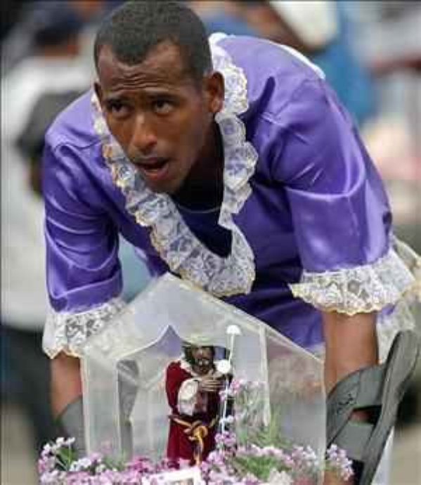 Faithful Roman Catholic pilgrims crawl on their knees, to face “El Cristo Negro” inside this Roman Catholic Church in Portobelo in Panama. The small statues of the false Messiah are black like ashes.
