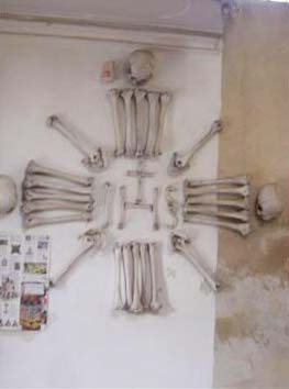 The skeletons have been artistically arranged to form decorations and furnishings for the chapel. All the bones were the victims of the Silesian wars and epidemics.