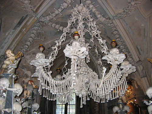 A priceless example of how dead people can decorate a full Church. Not only look down on people from the ceiling. But also reappear as a chandelier to please the Vatican.