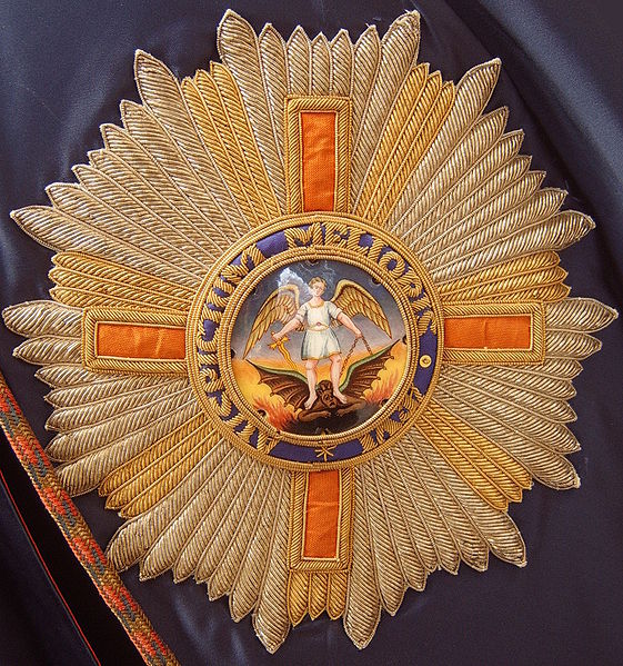 The star bears a red cross of St George. In the center of the star is a dark blue ring bearing the motto of the Order. Within the ring is a representation of St Michael trampling on Satan.